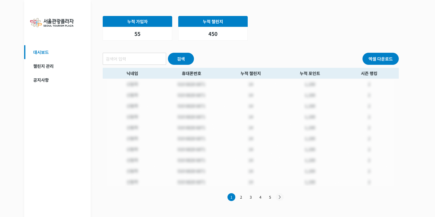 관리자 페이지에 로그인을 거쳐 들어오면 대시보드로 챌린지 참가자 분들의 정보를 한눈에 볼 수 있고,