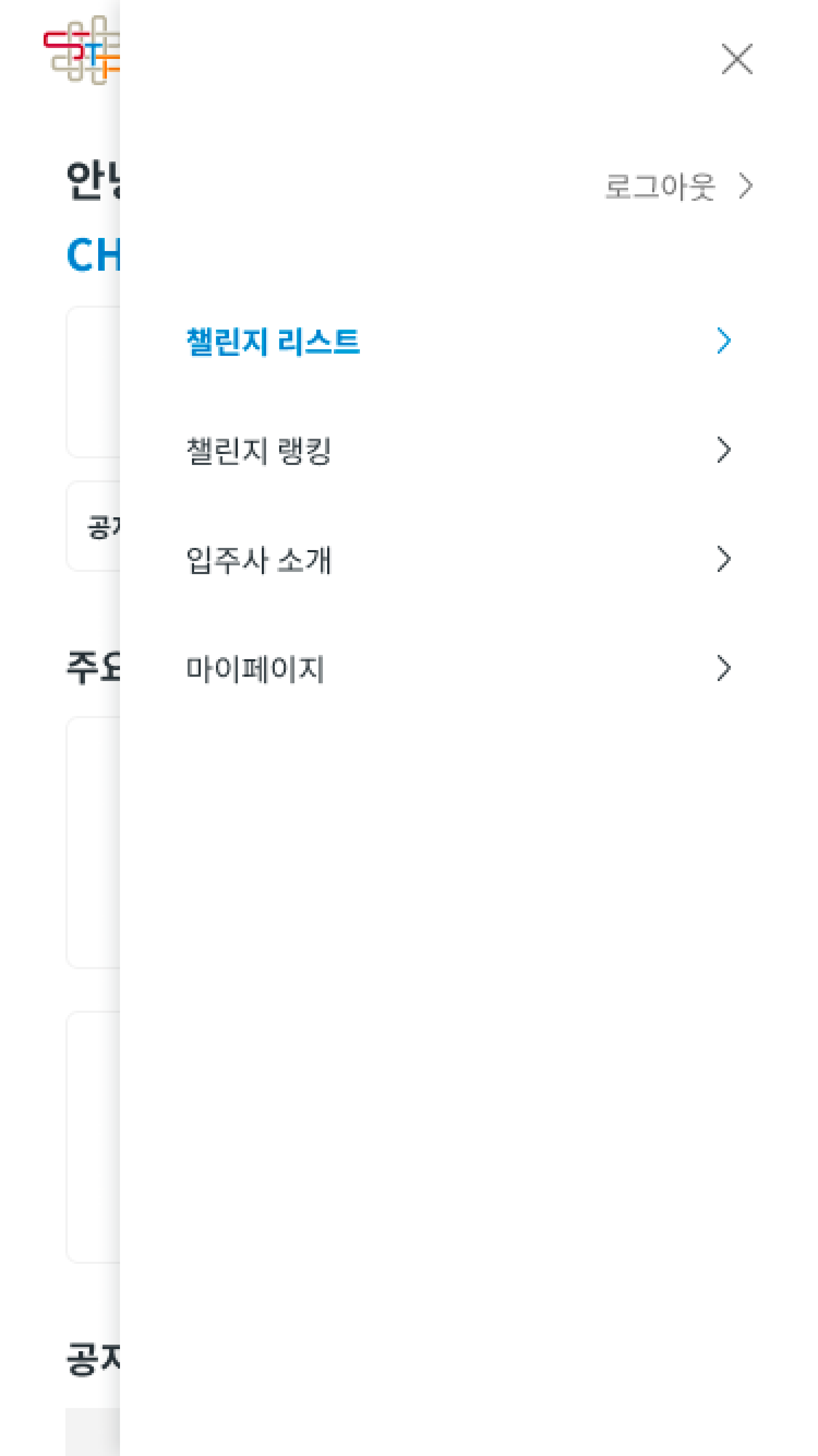 로그인 후 메인 화면에서 나의 챌린지 포인트, 등수를 바로 확인할 수 있어요. 햄버거 메뉴를 눌러도 메인 퀵 메뉴에서 이동되는 페이지 리스트가 보입니다:)