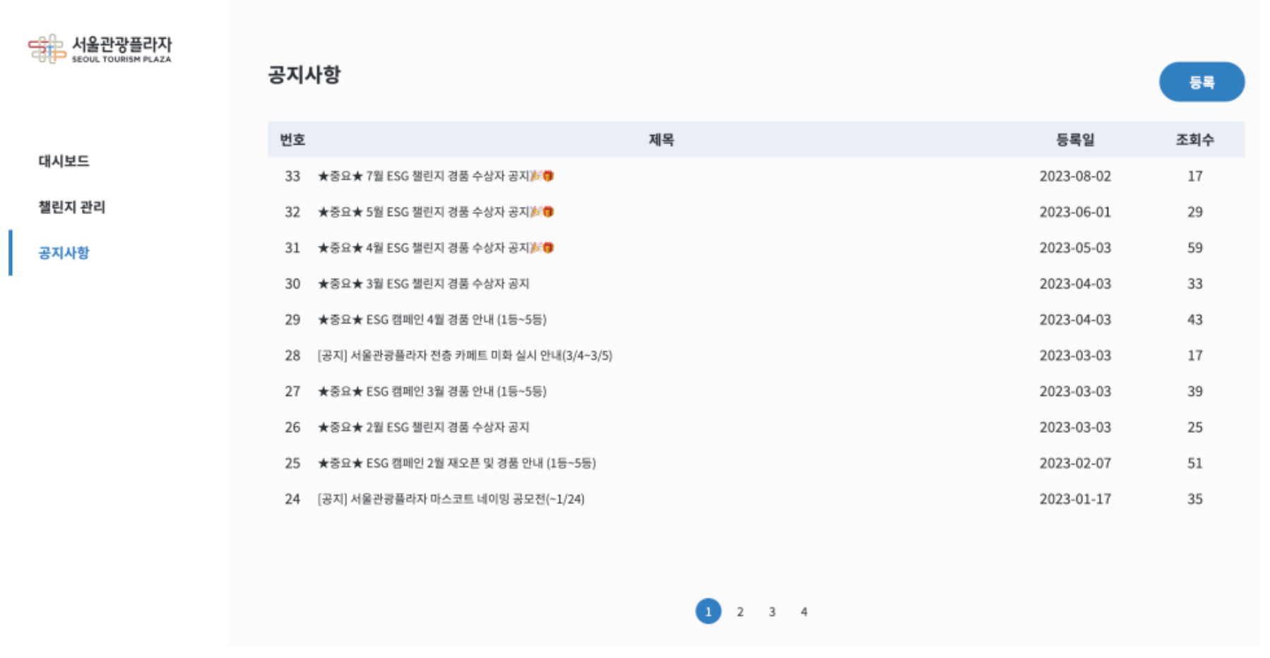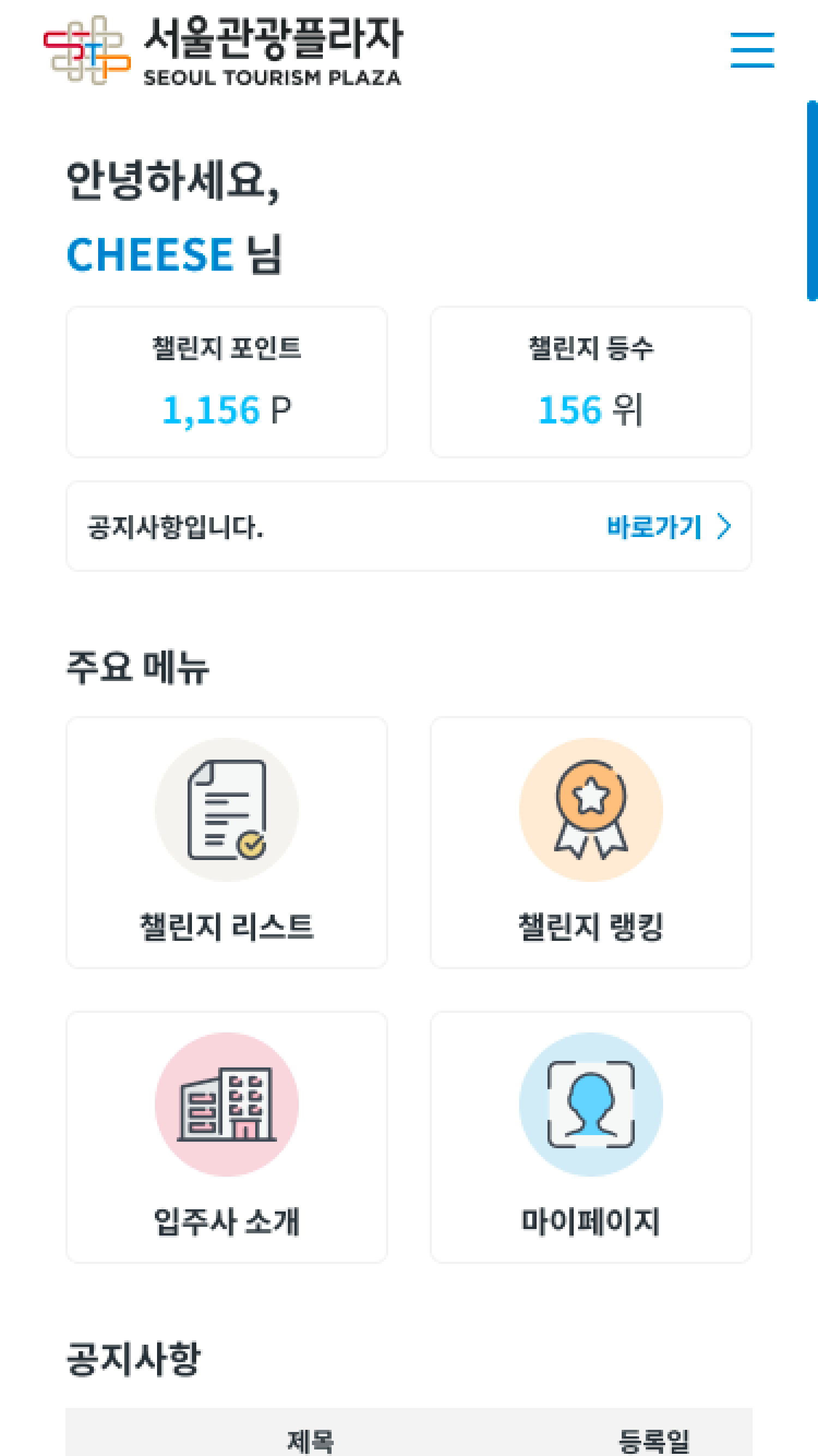 메인 화면 퀵 메뉴 아래에 공지사항을 바로 확인할 수 있어요:) 주로 서울관광플라자의 공지사항과 ESG클러스터 경품 수상자 공지로 활용을 합니다.