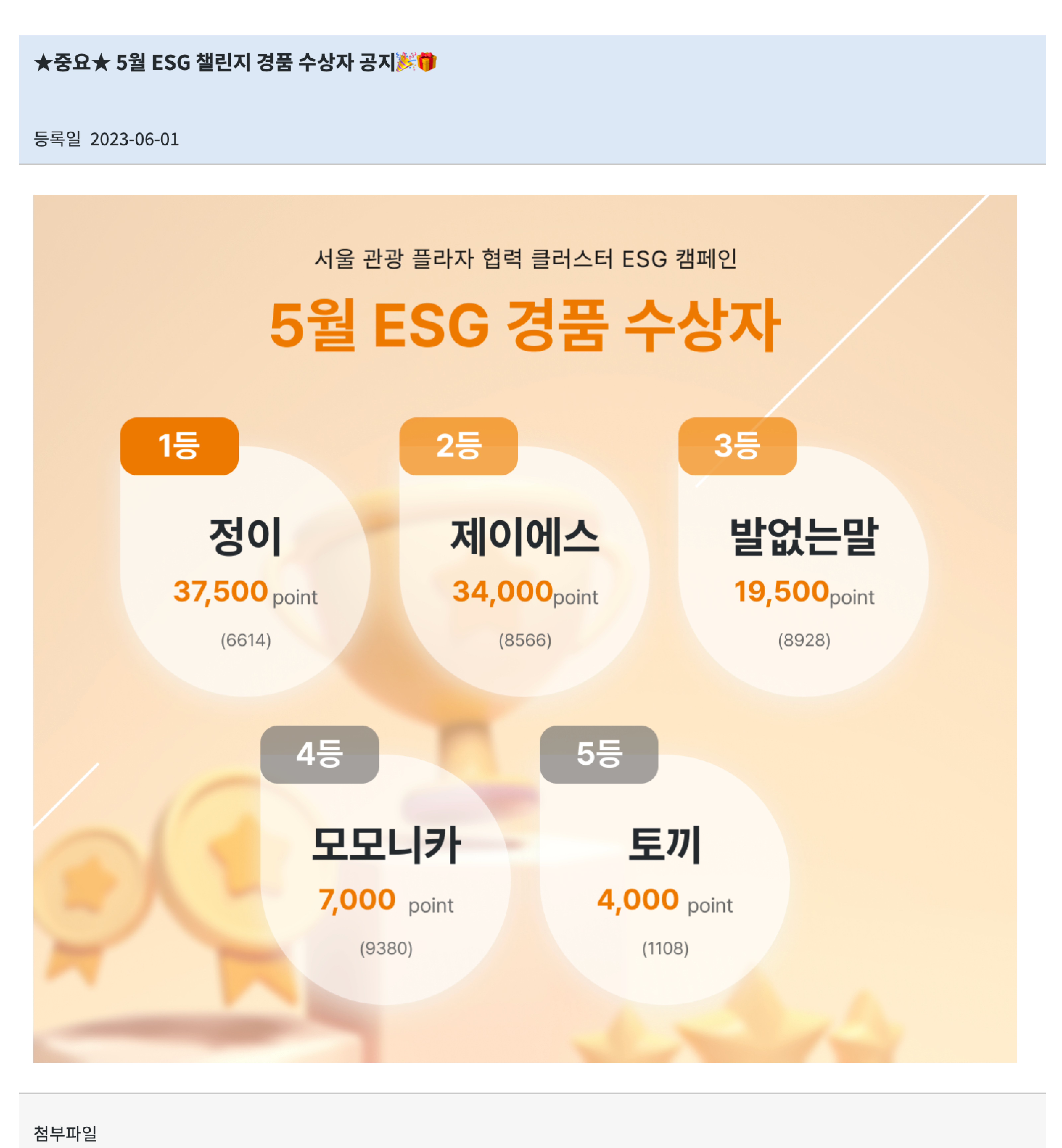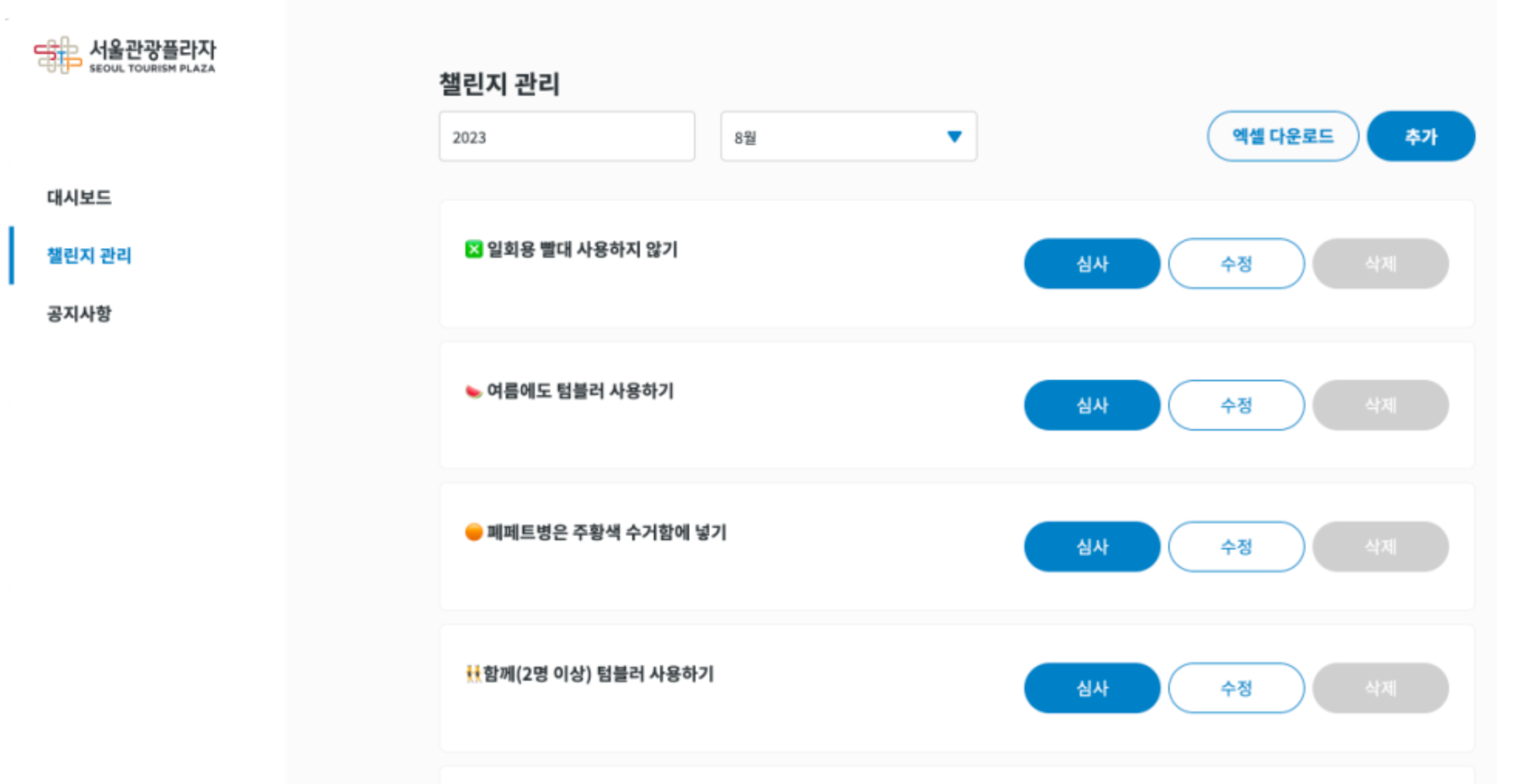 치즈에서 서울 관광 플라자 입주자를 대상으로한 캠페인으로 ESG챌린지 및 랭킹 기능과 관리자 시스템 페이지 제작 솔루션을 진행했어요:)
